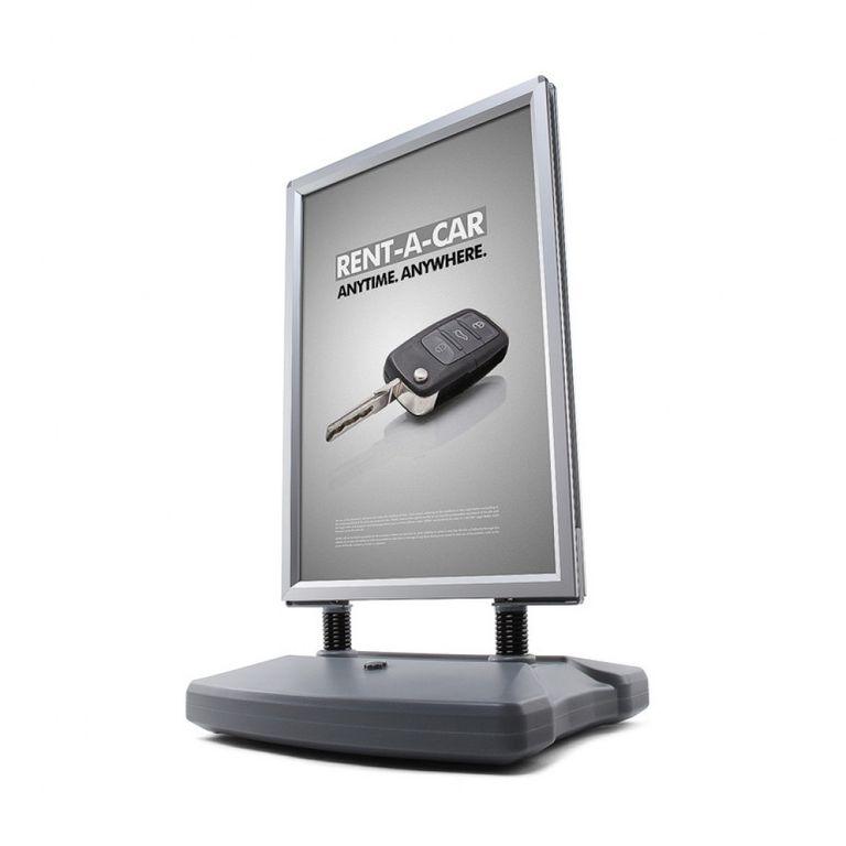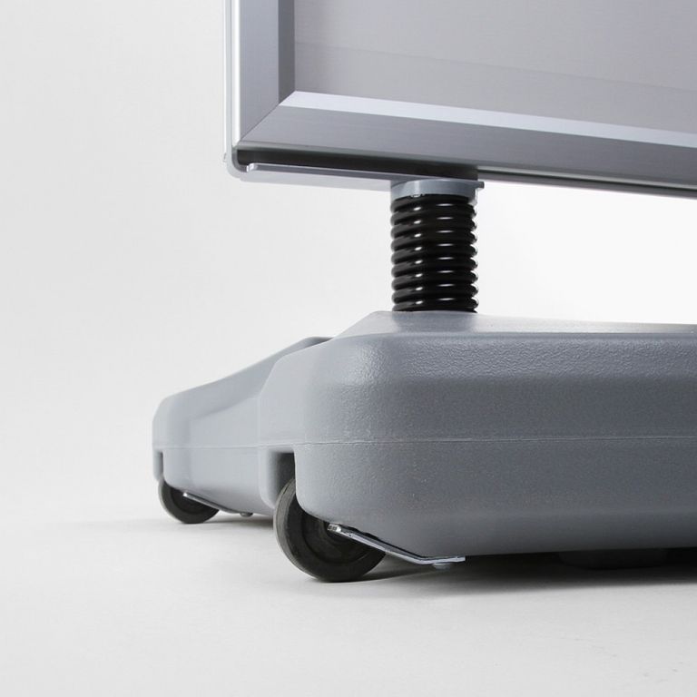 Speziell für Ihre Werbung in windigen Bereichen ist der Kundenstopper WINDTALKER® von cross effect in Ingelheim die optimale Lösung. Sein mit Wasser oder Sand befüllbarer Standfuß bietet in Verbindung mit den Spezialfedern aus Stahl eine hohe Standfestigkeit. Für den einfachen Transport sind im Standfuß Rollen integriert. So können Sie den Kundenstopper trotz des Standgewichtes einfach bewegen. Der Aluminium-Schnellwechselrahmen kann doppelseitig mit Plakaten bestückt werden und garantiert Ihnen auch bei hohen Windstärken eine auffällige Werbemöglichkeit.